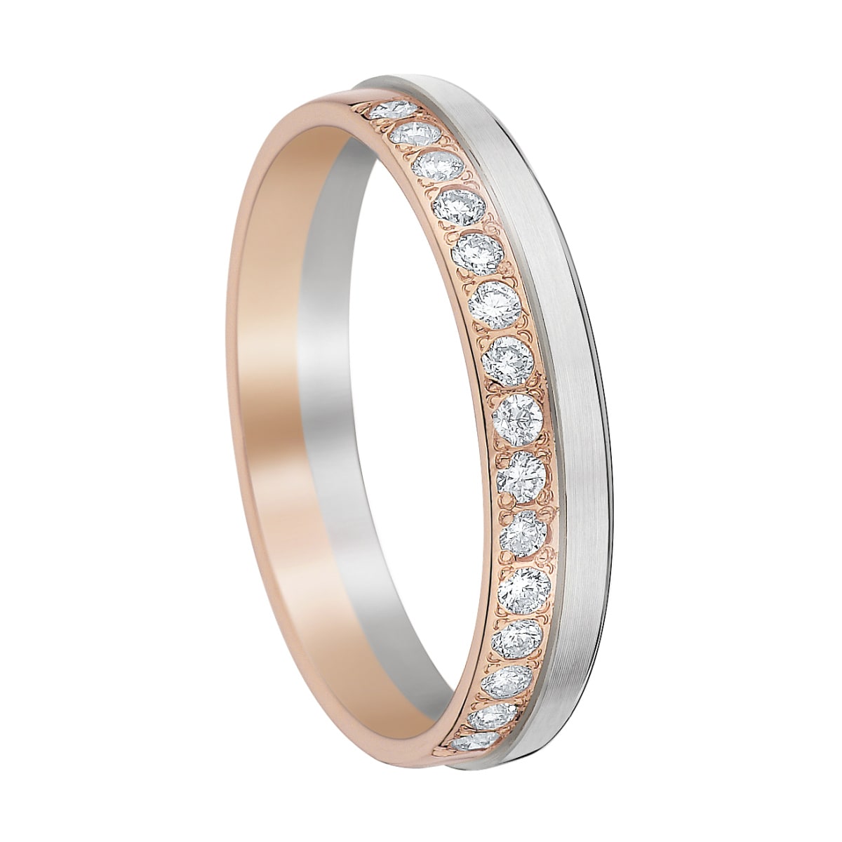 Divine alliance de 4mm avec ses 2 fils en or rouge serti de 15 diamants (0.255 carats). Un mariage de modernité et d'élégance.