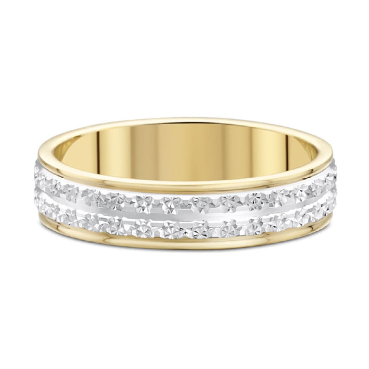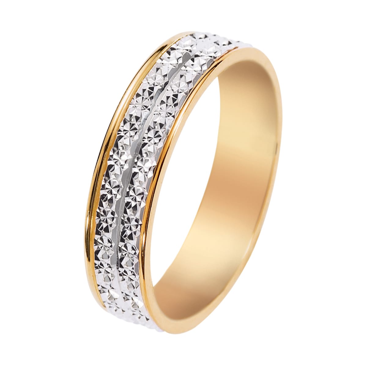 Alliance en or jaune aux motifs striés et rhodiés en or blanc