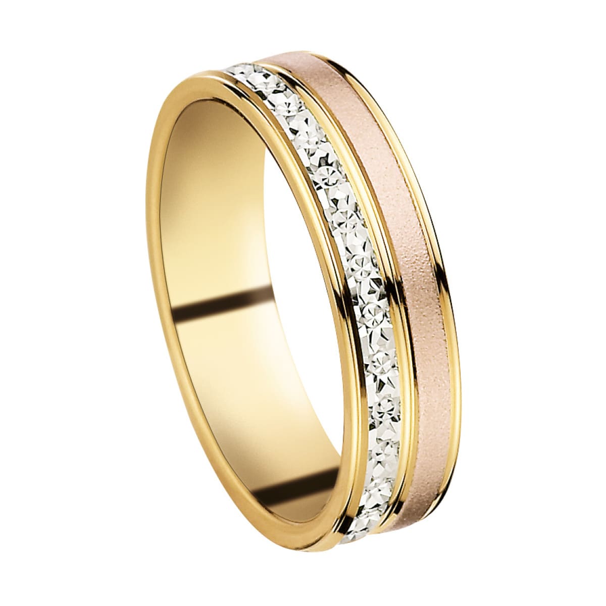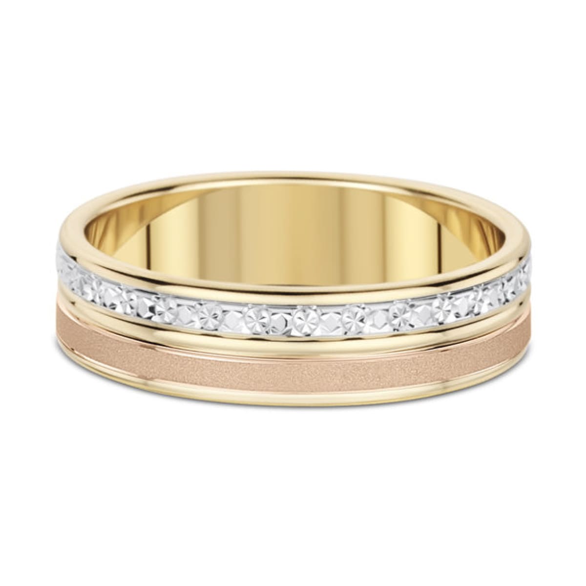 Anneau en or jaune poli sur lequel se superpose un délicat ruban en or rouge avec une finition sable et un autre or blanc diamanté. L'ensemble est d'une largeur de 5 mm.