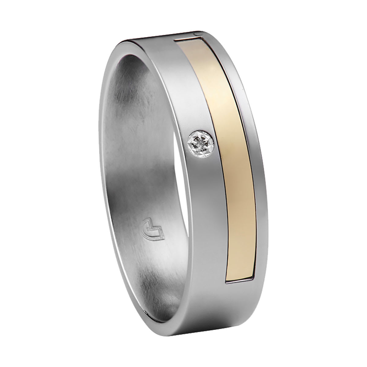 Combinant diamant, or jaune et acier inoxydable deux tons, la bague MIDGARD invoque la magie des runes nordiques.