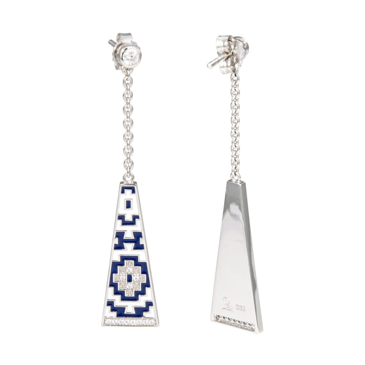 Les boucles d’oreilles triangles en argent Aztec Una Storia® ont été créées par nos artisans joailliers qui se sont inspiré de la culture Aztèque d’Amérique centrale. Leur forme pyramidale rappelle ces monuments étagés situés à Teotihuacán et datant d’une centaine d’années avant J.C. la laque de couleur traditionnellement blanche et bleue peinte à la main suit des formes géométriques incrustées de pierres en oxydes de zirconium.