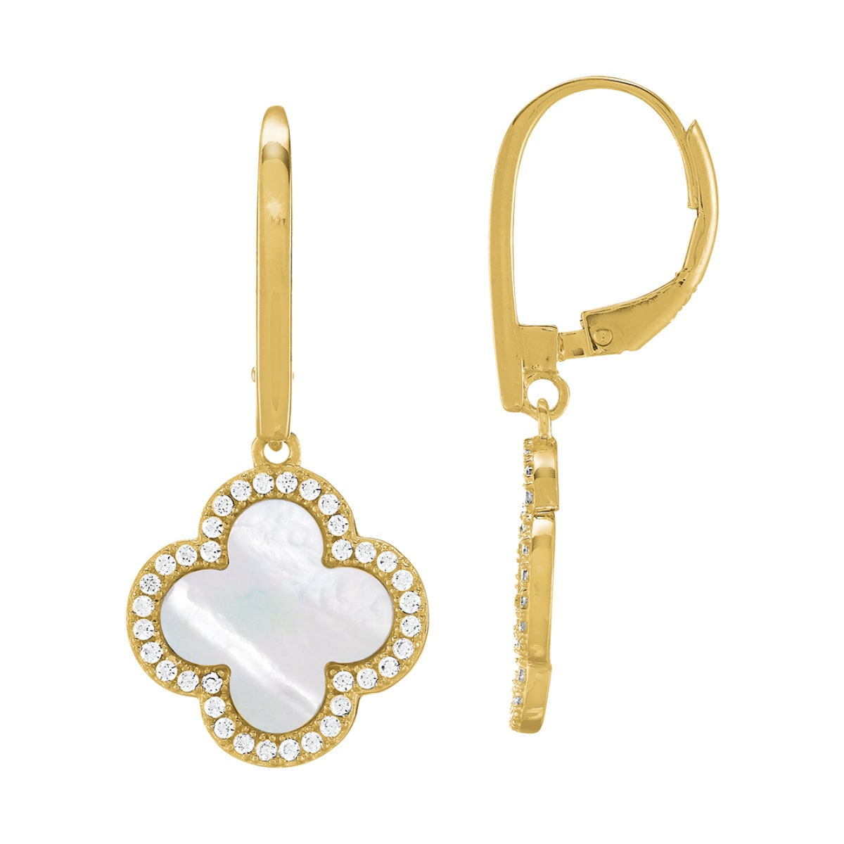 Les prix sont variables suivant le poids, la taille et le cours des matières premières.Pendants d’oreilles plaqués or, nacre et oxydes de zirconium