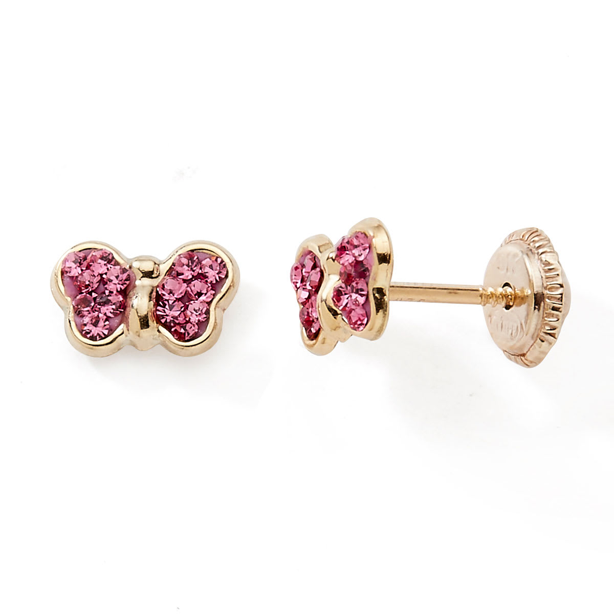 Boucles d’oreilles motif papillon avec ses ailes en cristaux roses et ses fermoirs à vis (sécurité enfant)