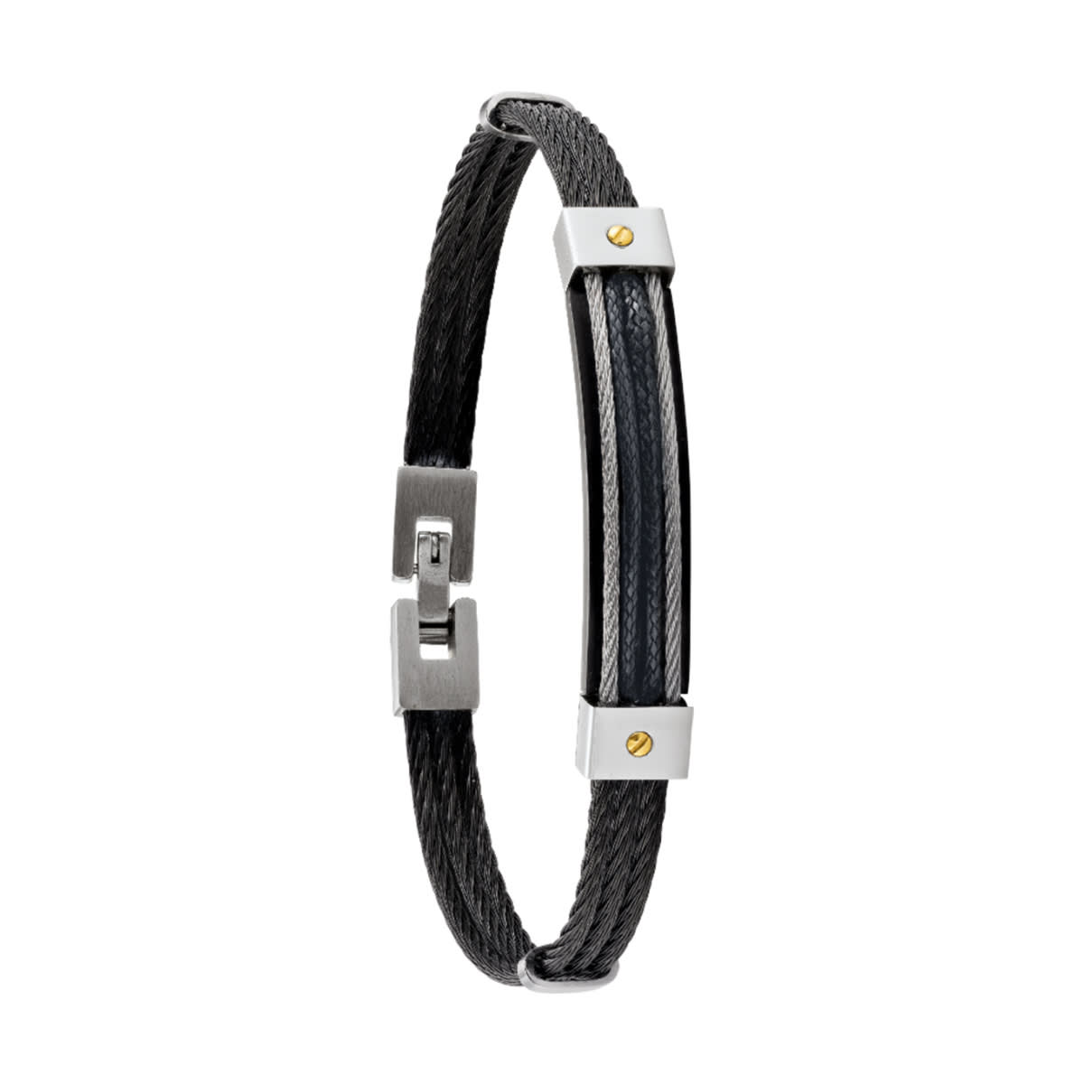 Bracelet de câbles d'acier inoxydable noir et orné d'un motif en acier inoxydable, vis en or et brins de cordelette.