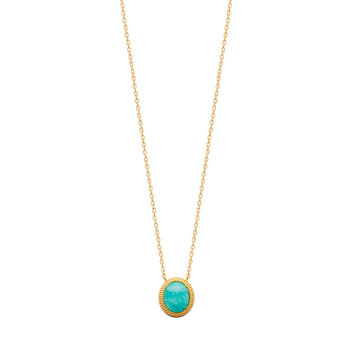 Vous apprécierez le travail délicat de mise en valeur autour de la pierre qui permet de déployer la lumière bleue de l'amazonite, le tout suspendu à une chaîne classique en plaqué or.