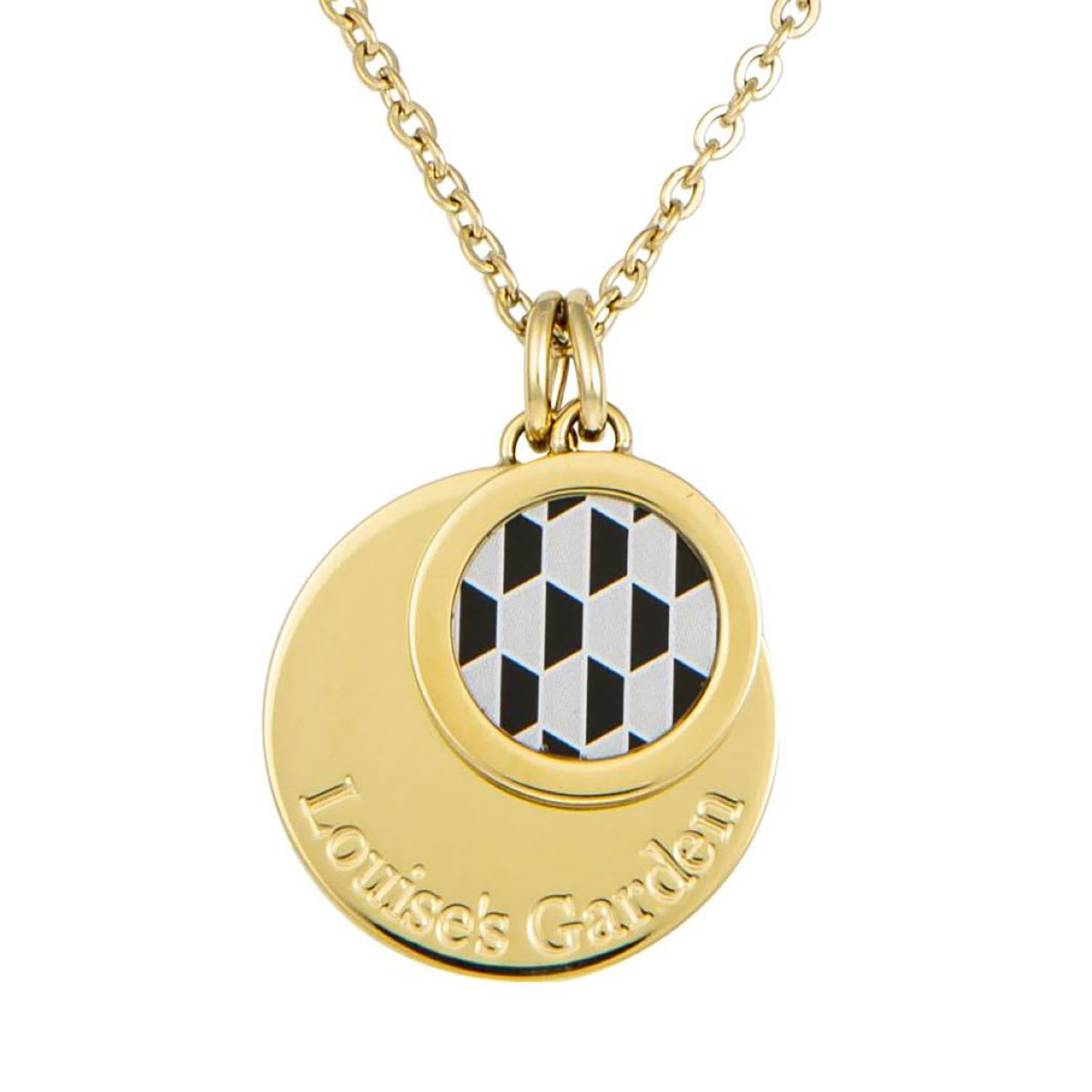 Le collier fantaisie bohème Palais Royal 2 médaillons Louise Garden est composé d’une chaîne de 42 cm de long + une extension de chaîne de 5 cm et de médaillons de 2.2 cm et 1.5 cm de diamètre. Cet ensemble est en acier inoxydable doré dont l’un des médaillons est recouvert d’un imprimé au motif graphique noir et blanc.