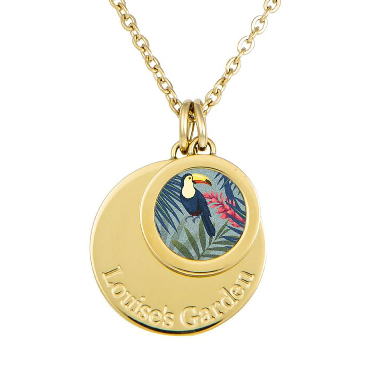 Le Collier fantaisie bohème Toucan 2 médaillons Louise Garden comporte une chaîne de 42 cm de long + une extension de chaîne de 5 cm. Les médaillons de 2.2 cm et 1.5 cm de diamètre sont comme l’ensemble, en acier inoxydable doré hypoallergénique. L’un des médaillons est recouvert d’un imprimé à l’effigie du Toucan évoluant dans une nature végétale tropicale vert tendre sur fond noir.