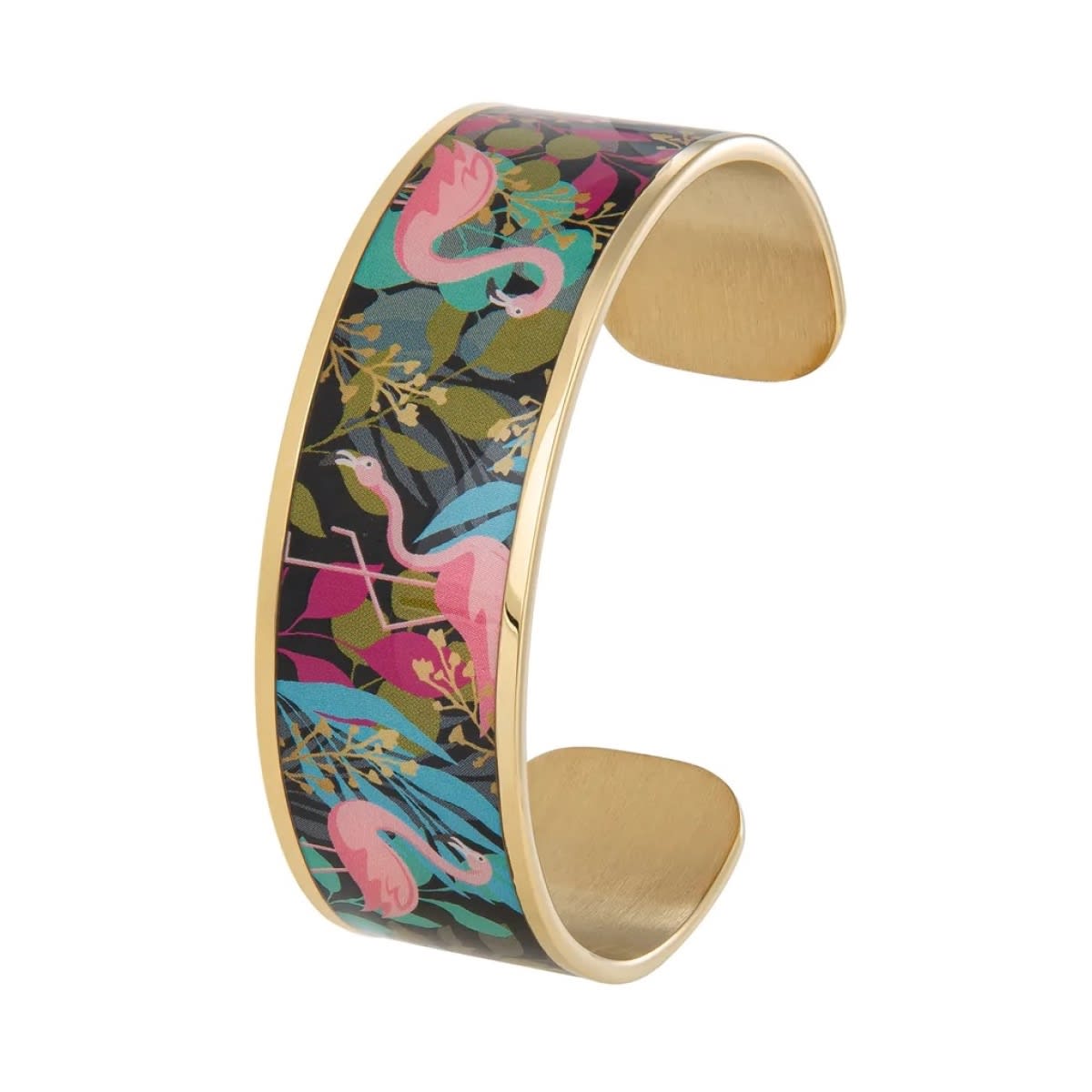 Le bijou flamant rose Louise’s Garden est un bracelet jonc ouvert en acier inoxydable doré recouvert d’un imprimé dont la sérigraphie montre ce bel oiseau migrateur dans des positions diverses sur le même fond coloré. On laisse libre l’imagination de l’observateur qui découvre le milieu ambiant exotique.