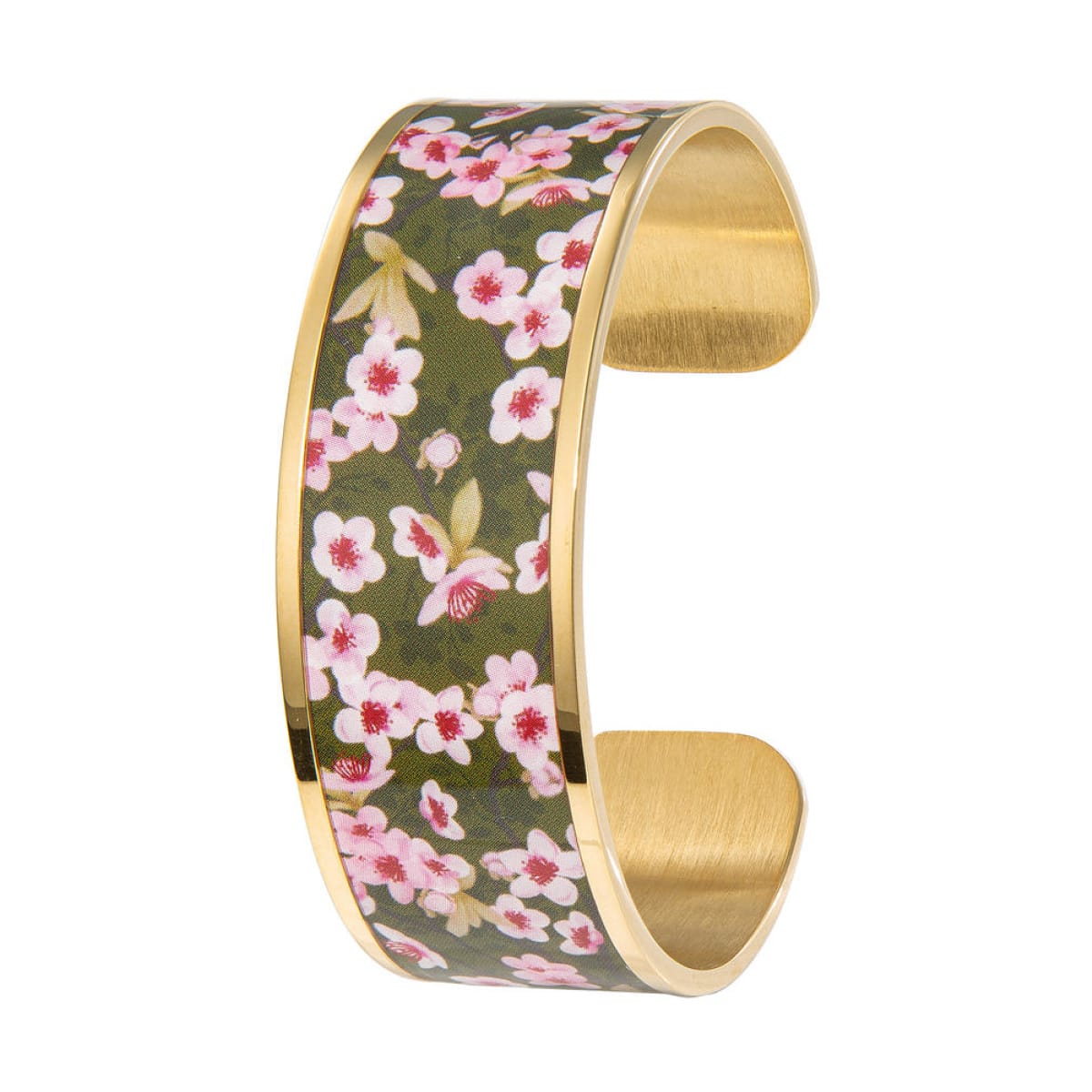 En portant le bracelet fleur de cerisier à votre poignet, vous embellissez votre peau nacrée d’une manchette fleur de cerisier très délicate et discrète. Ce jonc est en acier inoxydable doré hypoallergénique recouvert d’un imprimé composé de tendres fleurs rose poudré sur un fond d’azur pastel. Faisant partie des de la collection bijoux fleur de cerisier, ce bracelet vient agrémenter un joli top vert amande ou rose pâle que vous pouvez porter sur un pantalon en lin blanc ou grège et des escarpins fins en cuir lisse.