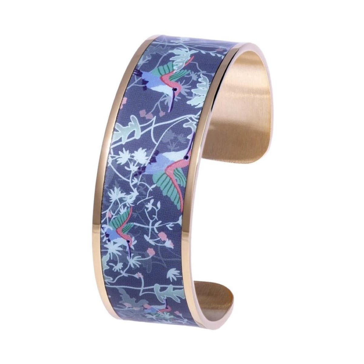 Manchette 22mm en acier doré, ornée de colibris en milieu naturel et aux tons bleus