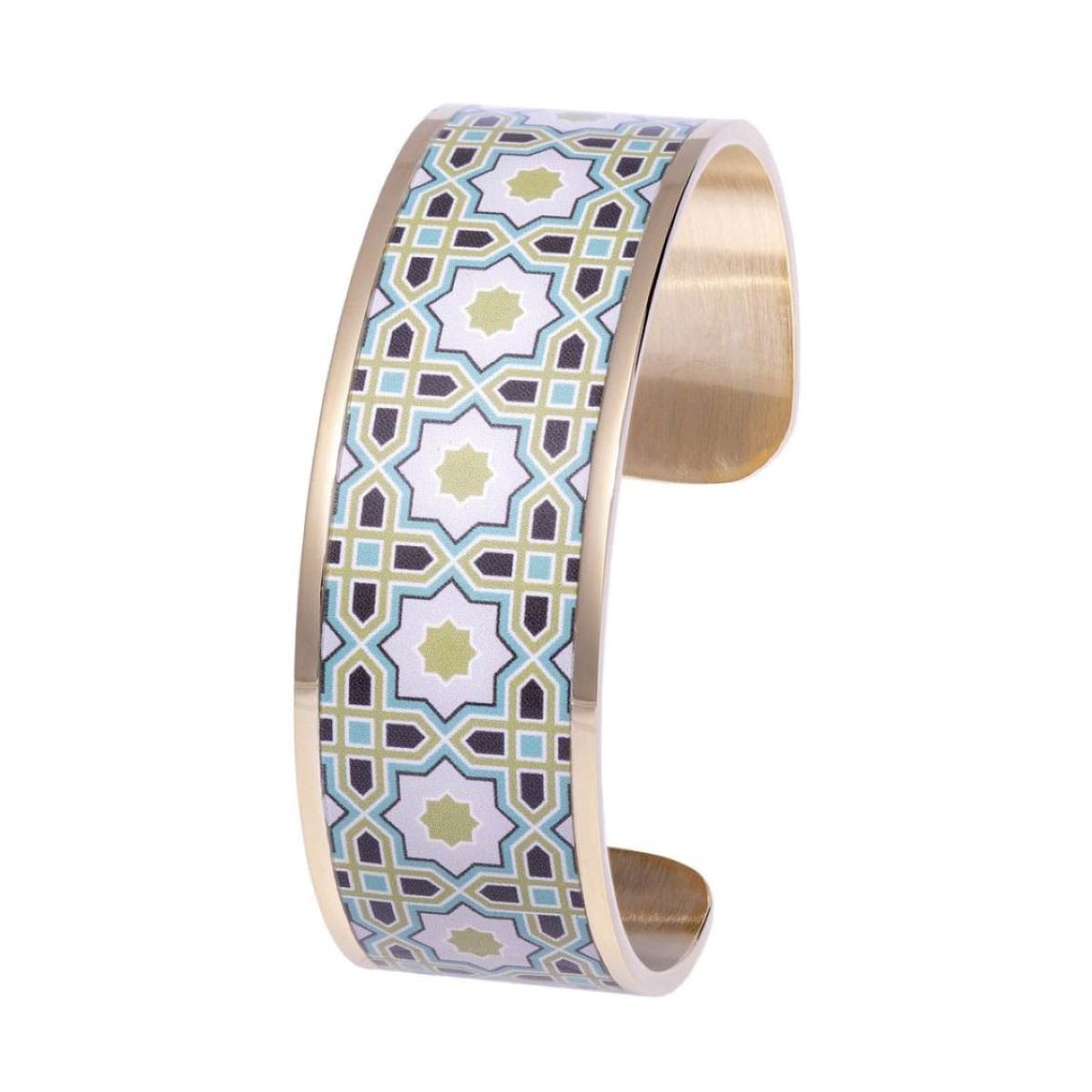 Manchette 22mm en acier doré, à motifs géométriques insipirés de l'Edelweiss et aux tons clairs et lumineux