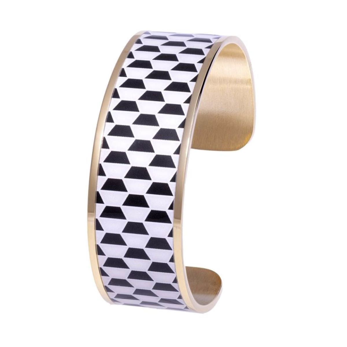 Manchette 22mm en acier doré, à motif graphique inspiré des colones de Daniel Buren en noir et blanc