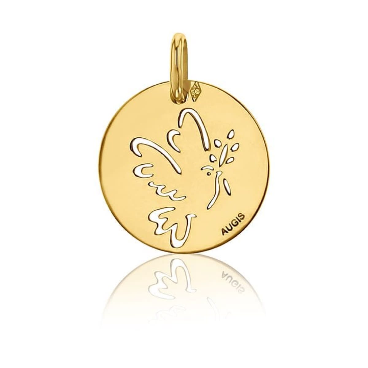 Cette médaille ronde est en Or Jaune 18 carats. Sur la pièce de la médaille est représenté une Colombe en envol ajourée en son centre. La bélière est de forme ovale. La médaille est en finition poli brillant. Le diamètre de la médaille est de 15 millimètres.