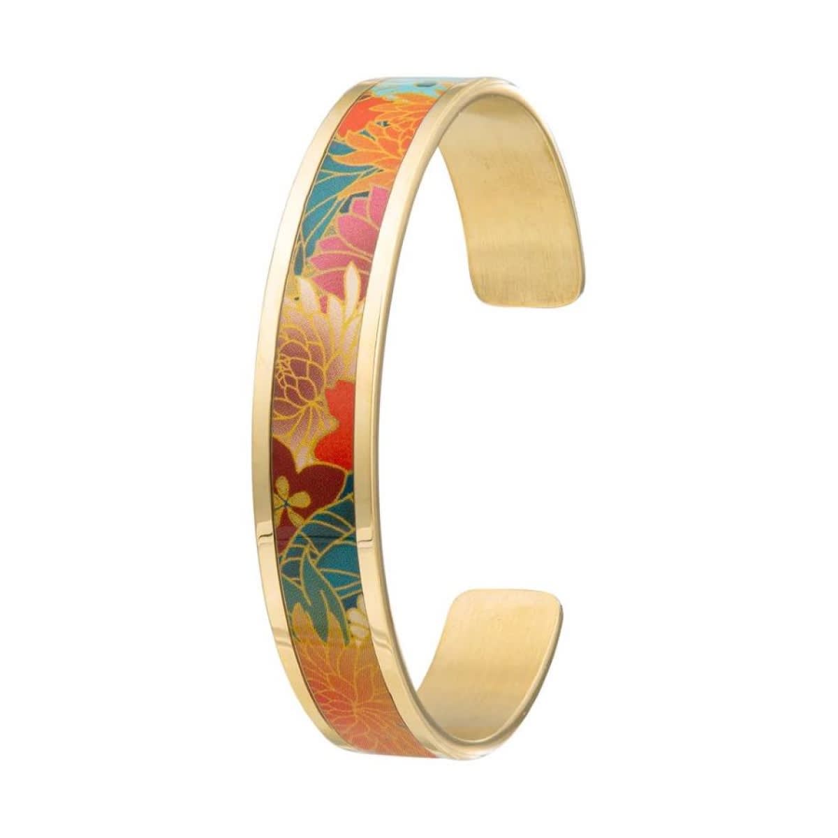 Les prix sont variables suivant le poids, la taille et le cours des matières premières.Petite Manchette Louise’s Garden Fleur de Lys est en acier doré recouvert d’un imprimé irisé.