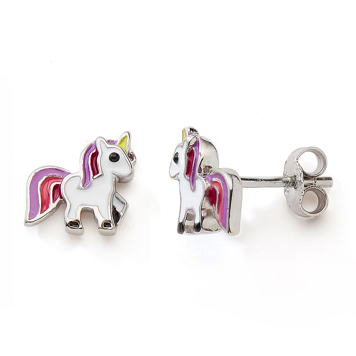 Boucles d’oreilles licornes en argent pour petite fille. Un bijou en émail dont les couleurs donnent du peps au modèle. Un bijou pour toutes les rêveuses !