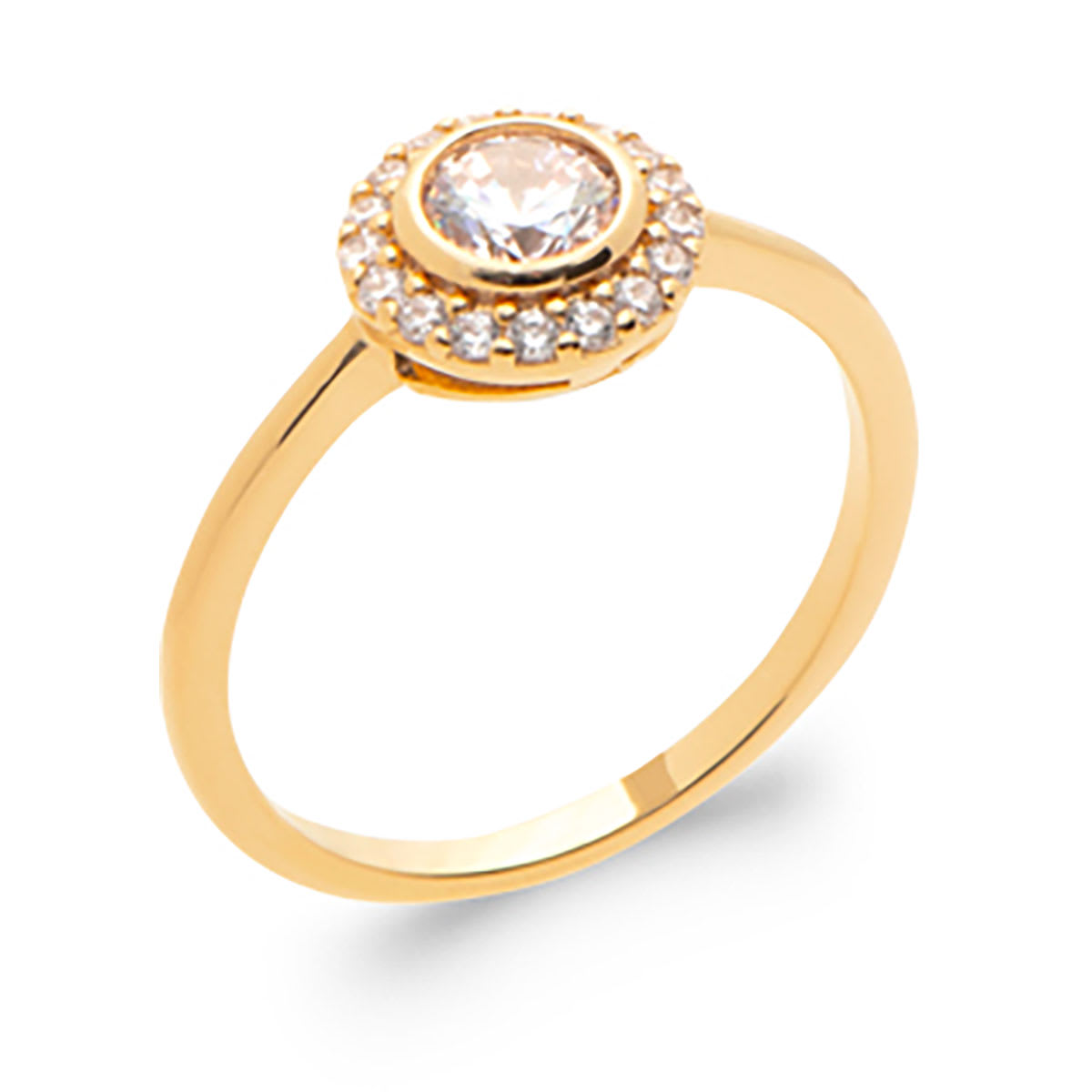 Cette bague solitaire est un classique de la bijouterie. On apprécie le serti clos et l'entourage d'oxydes de zirconium qui donne une belle présence à la pierre centrale.