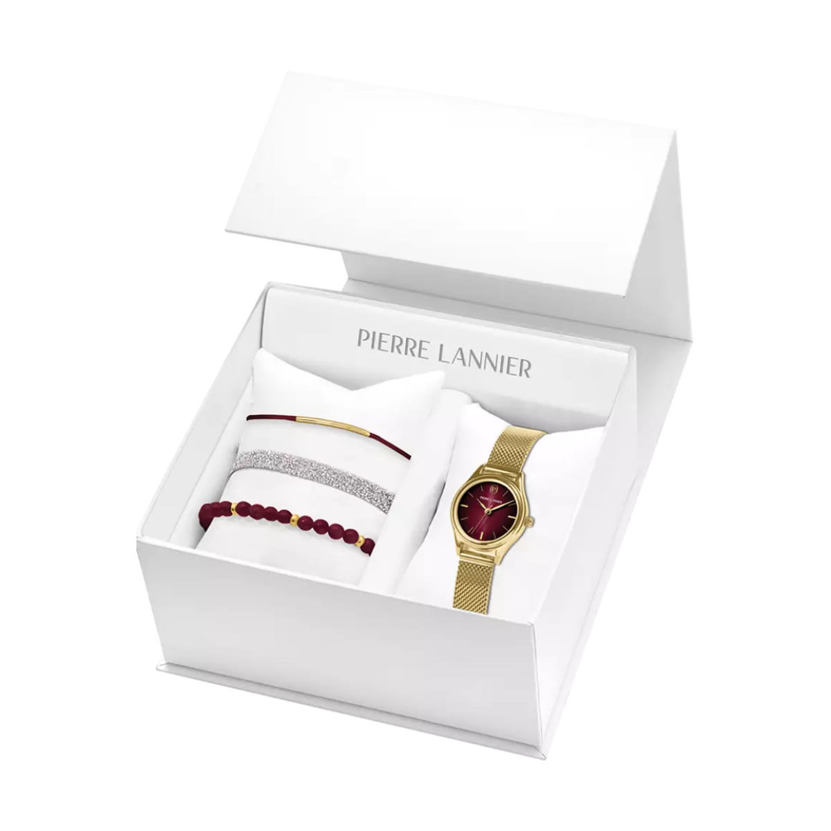 Prix de vente conseilléLe coffret PYA 169D552 associe une montre à cadran bordeaux fumé et bracelet milanais doré à trois bijoux “Les Interchangeables”. Un ensemble raffiné et féminin, idéal à offrir.
