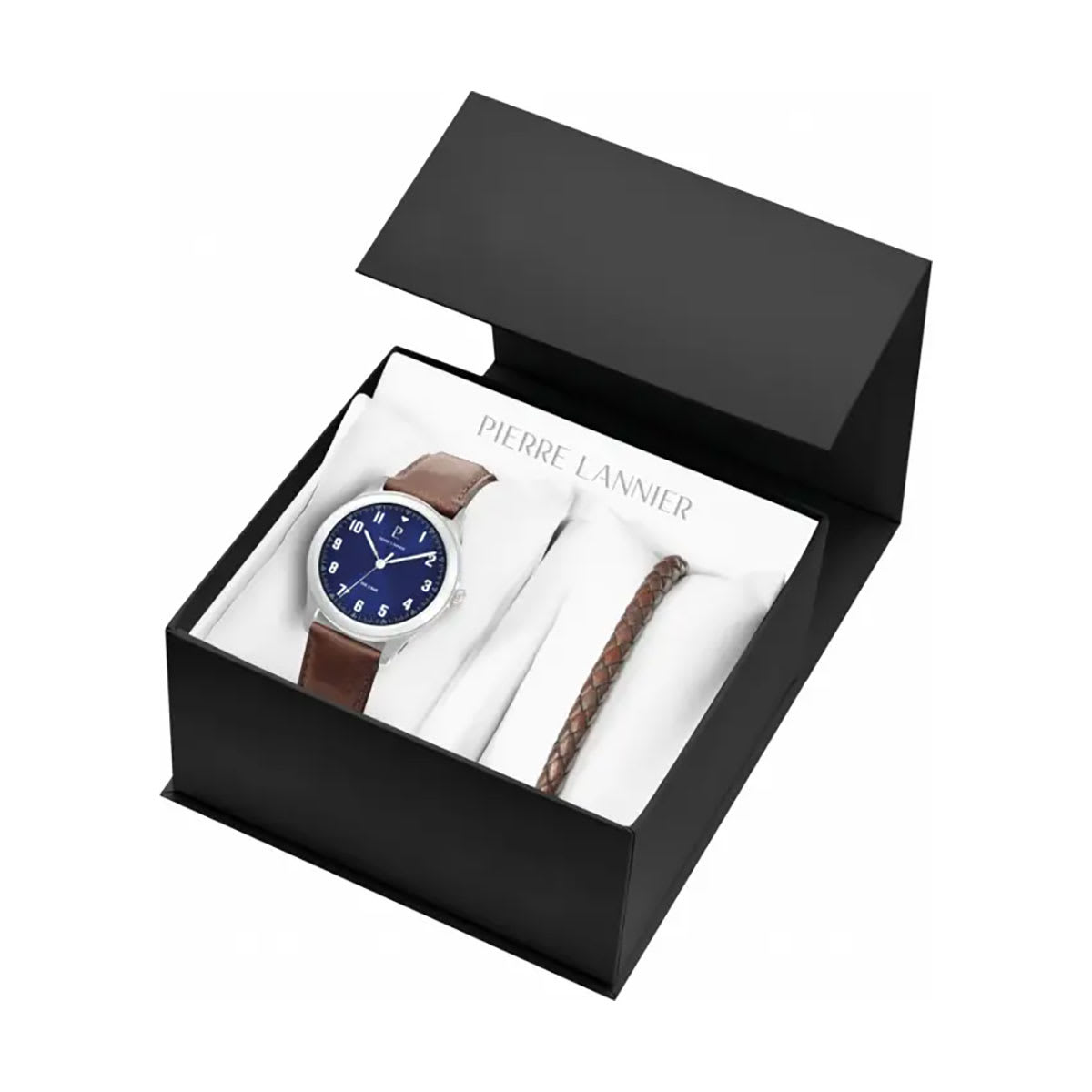 Prix de vente conseilléLe coffret Aviateur 379F164 réunit une montre vintage au cadran bleu soleillé et un bracelet en cuir tressé marron. Fabriqué en France, il associe style et élégance masculine.