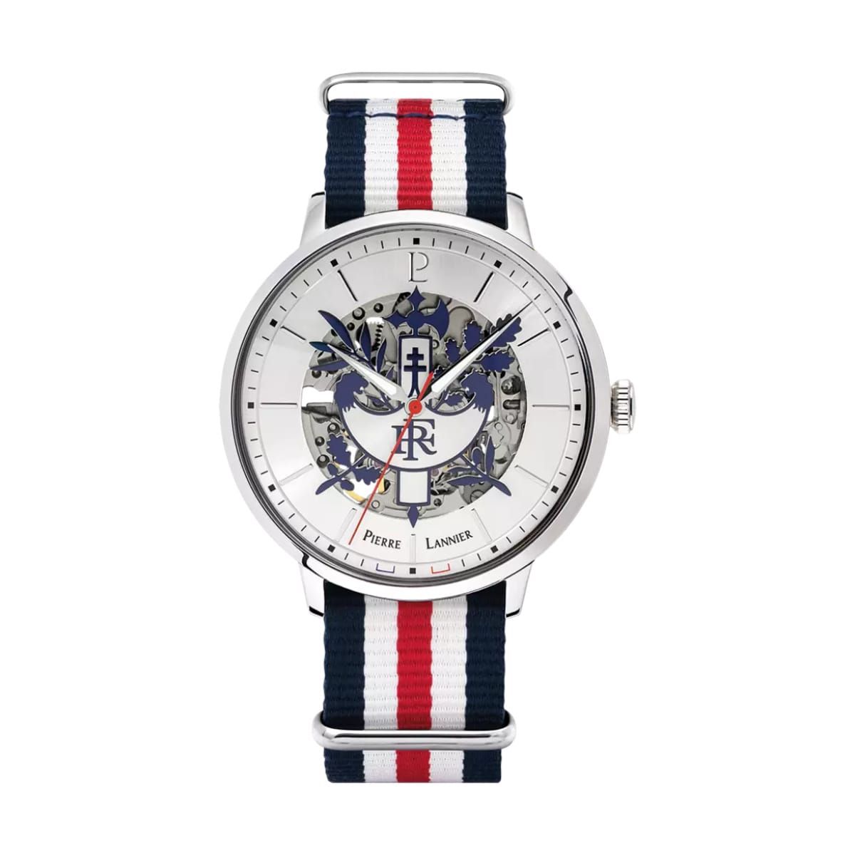 La montre automatique, au cadran squelette et boîtier en acier inoxydable de 42 mm de diamètre, dévoile l’emblème de l’Élysée et de la République Française, affirmant son caractère unique. Dotée d’une réserve de marche de 42 heures et étanche jusqu’à 50 mètres, elle allie technicité et élégance intemporelle.