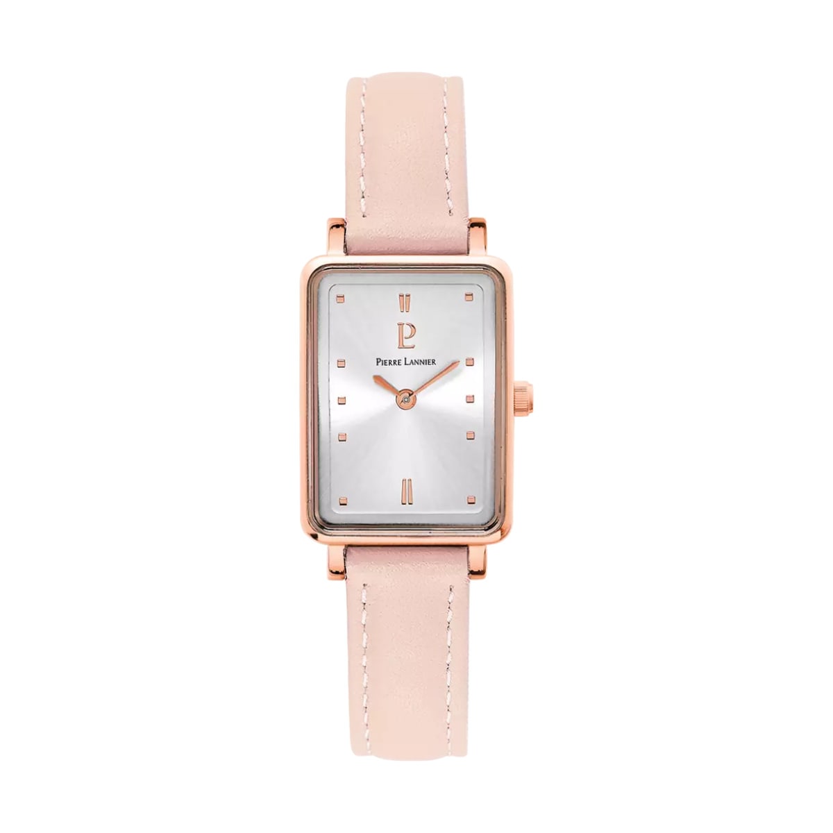 La montre Femme Ariane 057H925 possède un boitier en acier inoxydable doré rose, rectangulaire, de 21mm x 28.4 mm. A l'intérieur, le cadran est argenté avec un bel effet soleillé pour apporter originalité et luminosité à ce modèle de montre pour femme. Les index sont carrés pour rappeler l'esprit vintage de ce garde temps et les aiguilles en pointe, tous deux de couleur doré rose.