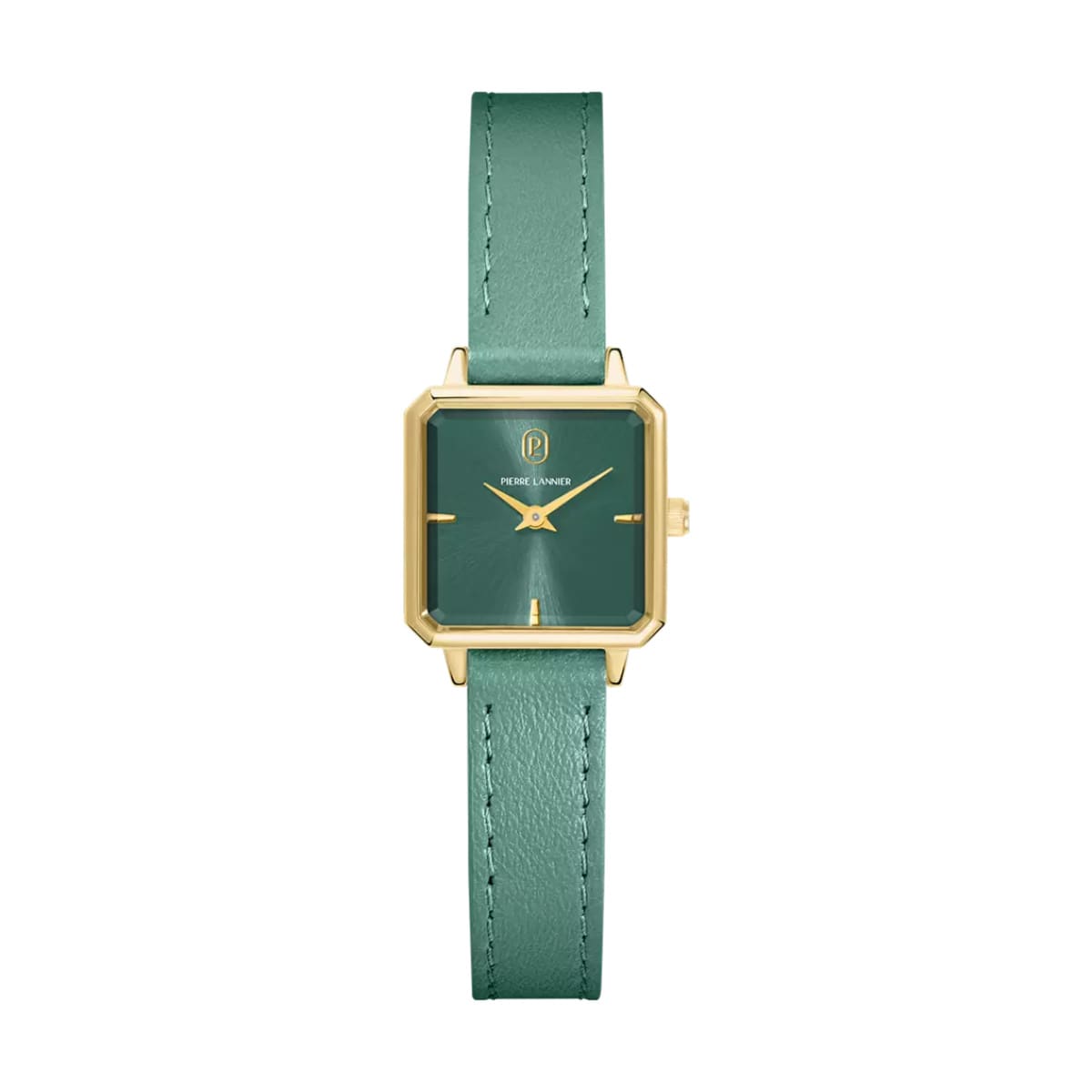 La montre Leonor 072J577 se distingue par son cadran vert soleillé et son bracelet cuir de veau vert coupé franc. Fabriquée en France, elle allie audace et élégance.