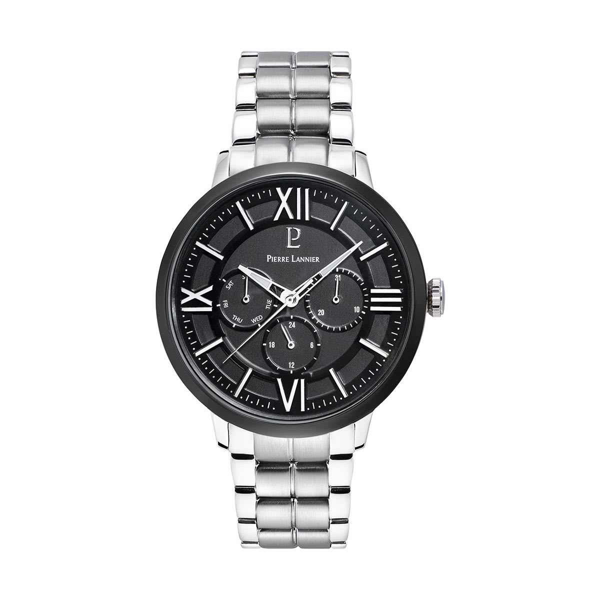 Montre Pierre Lannier Homme Automatique Paddock est en acier noir, cadran squelette noir où l’on voit le mécanisme.