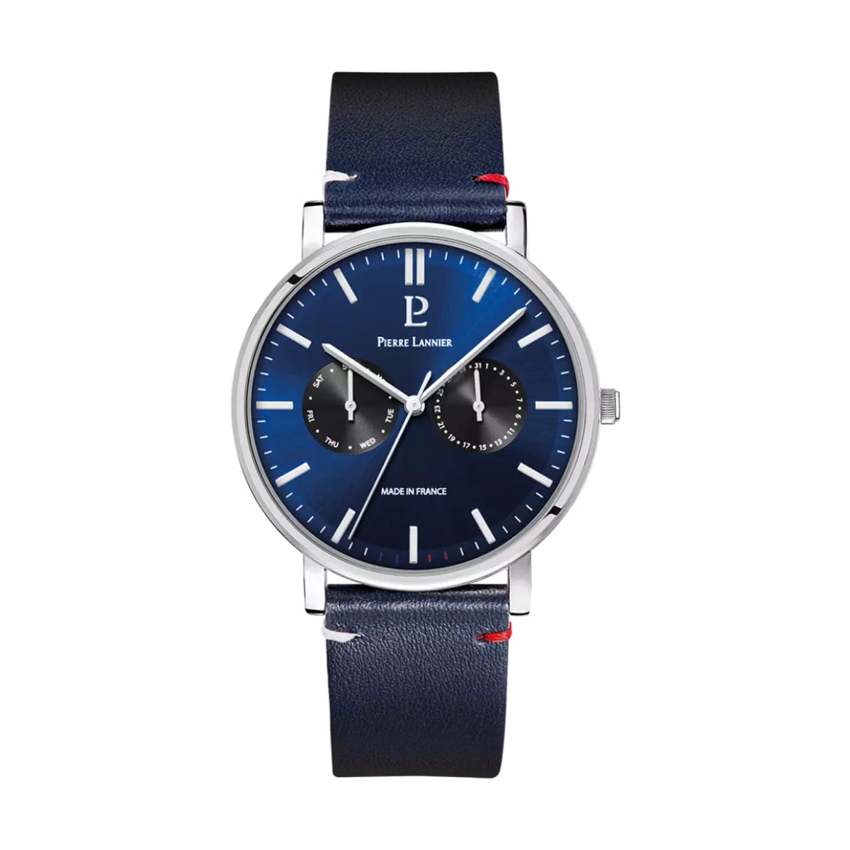 La montre Essential 206J166 séduit par son cadran bleu soleillé multifonction et son bracelet cuir bleu patriotique. Une montre moderne et pratique, fabriquée en France.