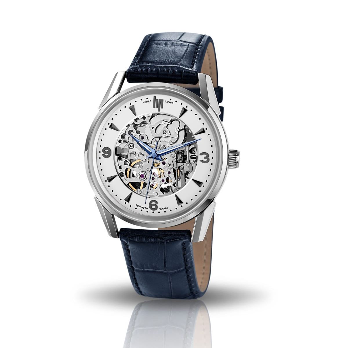 Montre automatique Lip acier - cadran argenté laissant apparaître le mouvement - index et chiffres arabes argentés - 3 aiguilles bleu nuit - bracelet cuir bleu foncé façon croco - étanche 5ATM. Garantie mouvement 2 ans