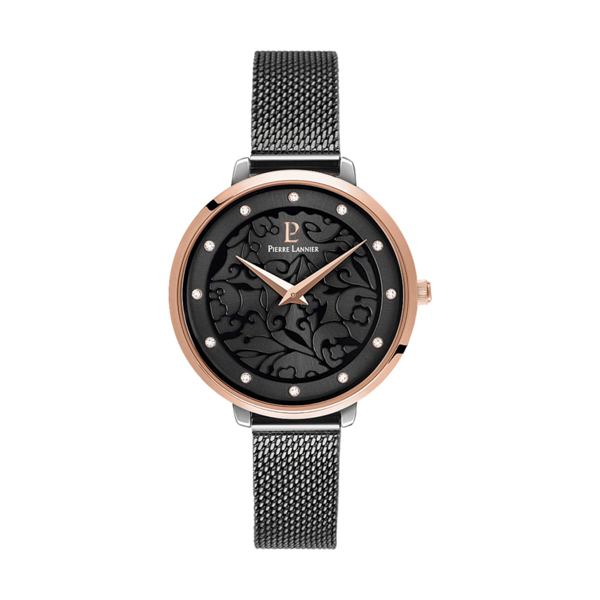 Montre Pierre Lannier Automatique Femme Paddock en acier noir, cadran squelette avec un étrier de frein bleu ciel, index noirs et les aiguilles bleu et noir