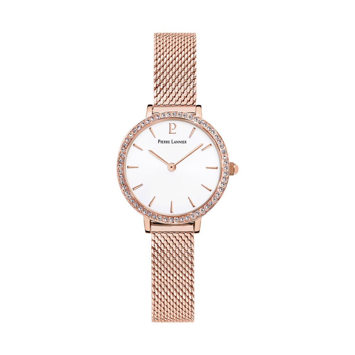 Montre Pierre Lannier Automatique Femme Espérance en acier doré-rose, cadran blanc cœur ouvert orné de motifs de trèfles, les index et aiguilles doré-rose.