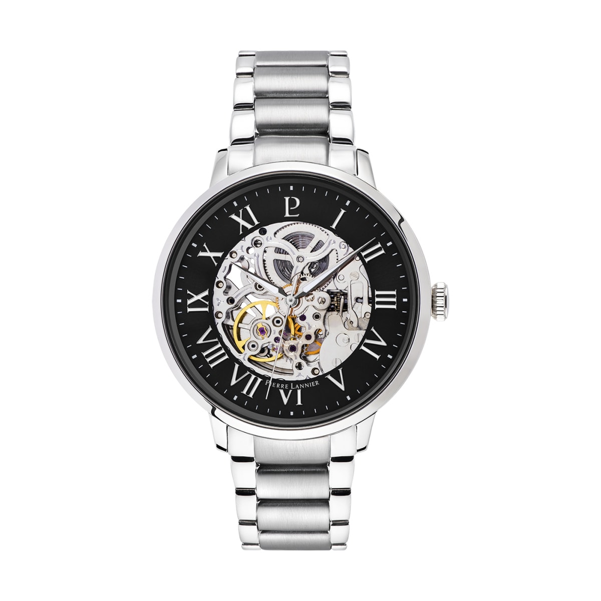 Montre Pierre Lannier Homme DATA en acier, cadran bleu avec affichage des heures, des minutes, des secondes, des jour et date, index et aiguilles argentés.